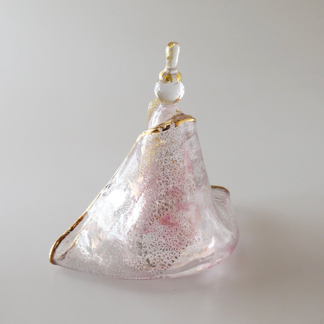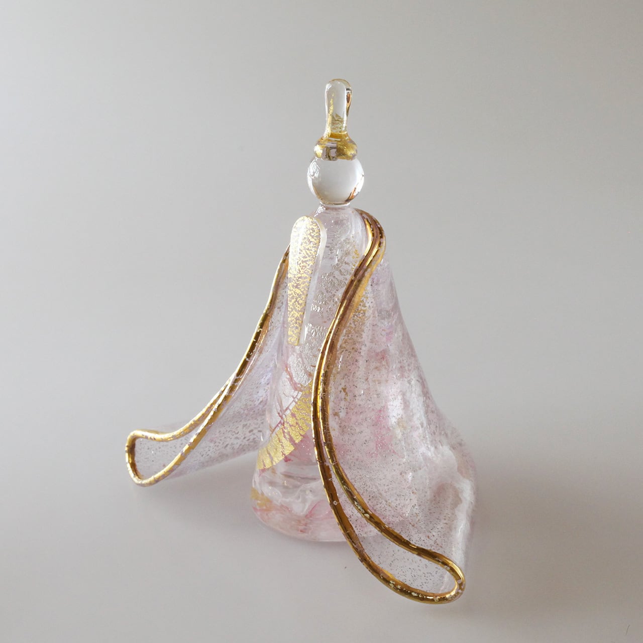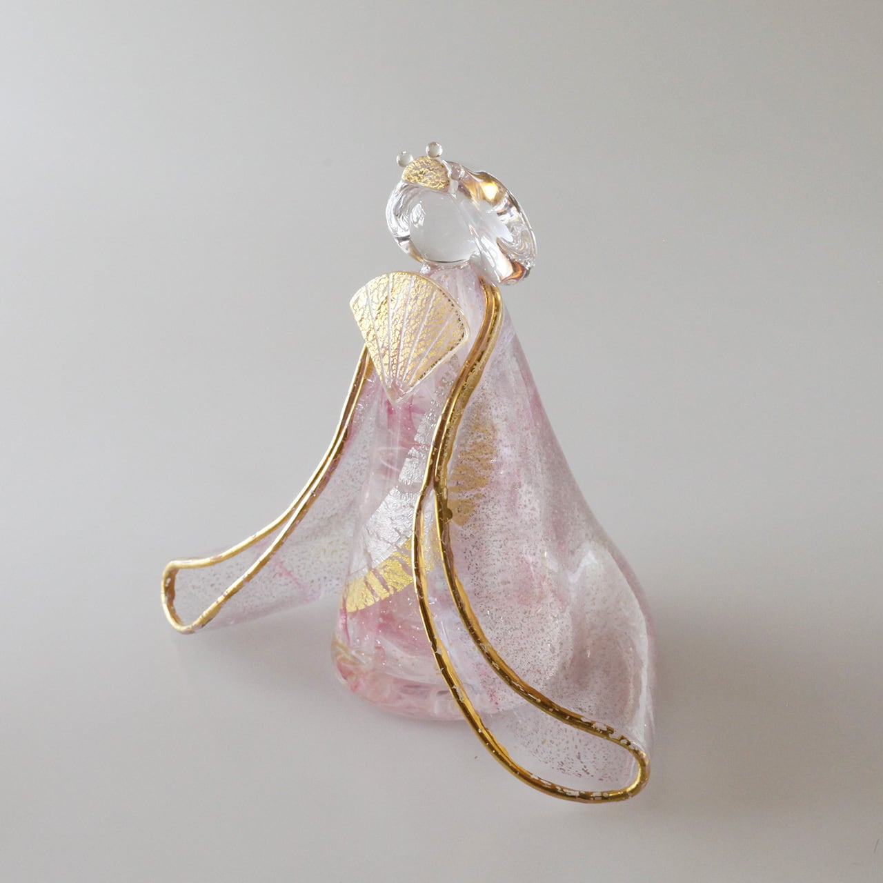 白×ピンク赤×金銀雲母を織り交ぜた着物や身体、数多く入り込んだ気泡がガラスの透明度や輝きをより一層際立たせます。