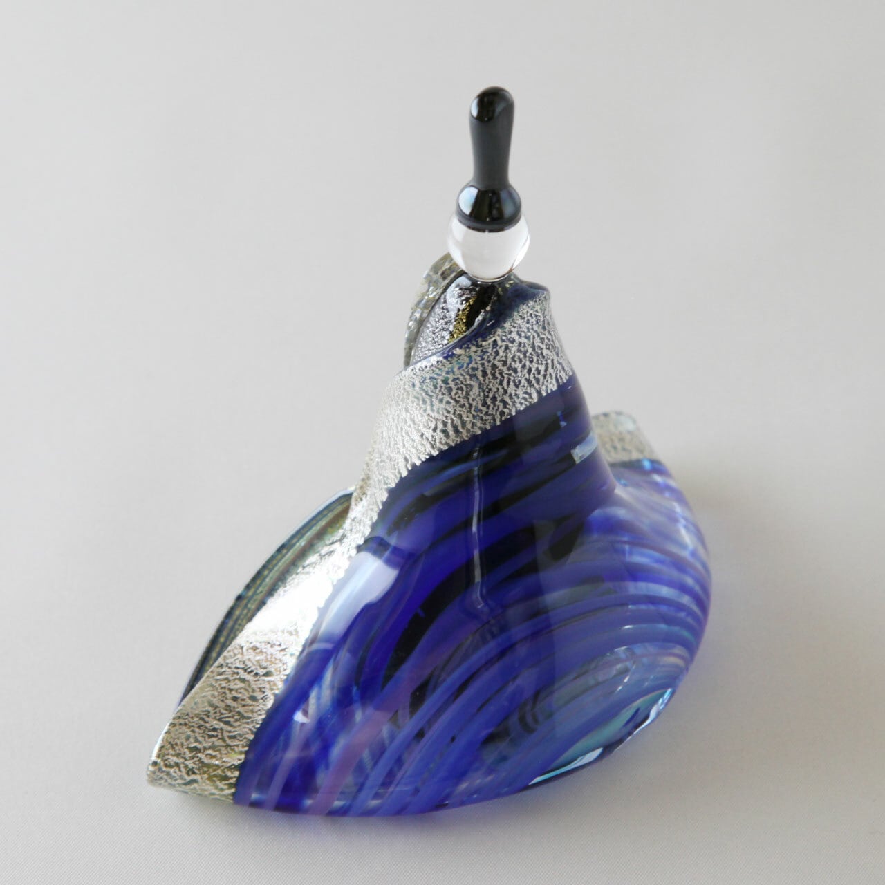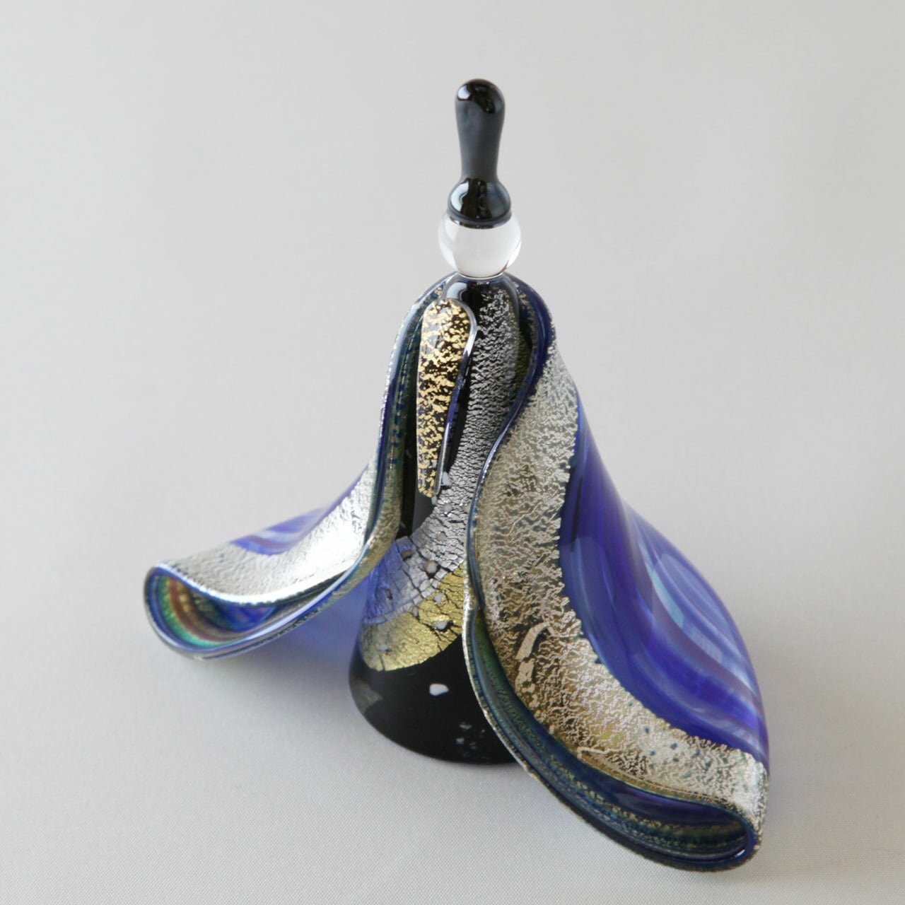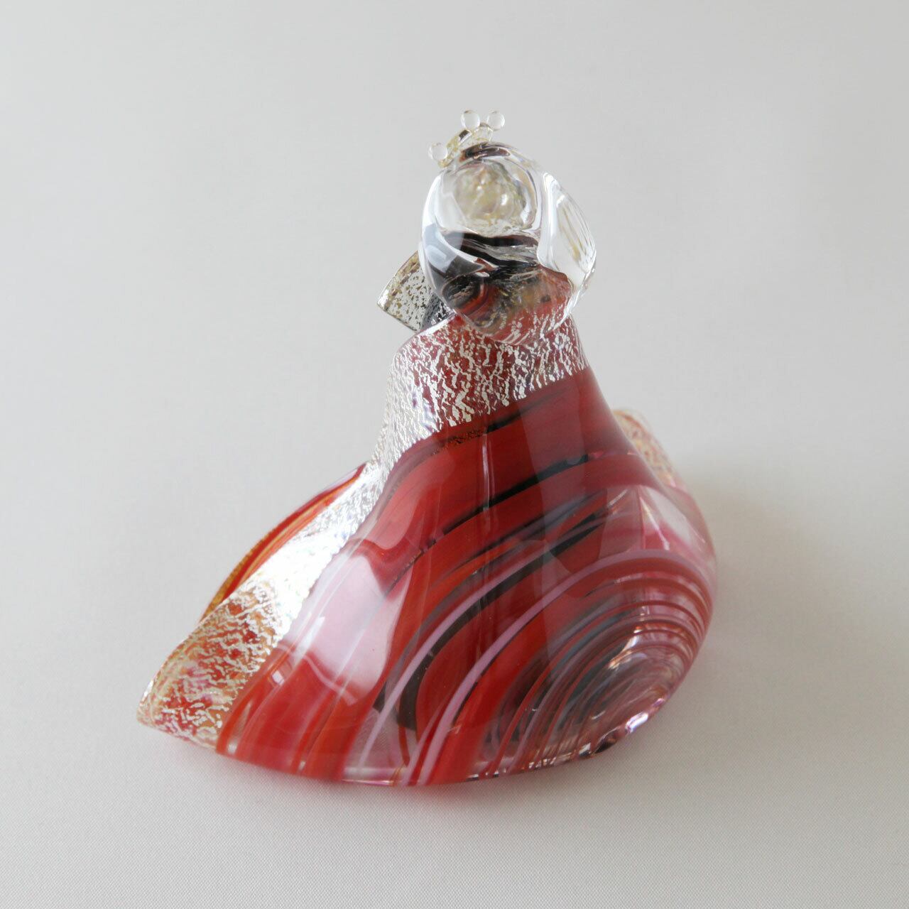 織物は硬質なガラスを感じさせない流線な形状で柔らかさを、そこに金澄・銀澄(金箔、銀箔の箔の厚打ち)を使用することで優雅さも演出しております。一点一点丁寧に仕上げたワンアンドオンリーで繊細なガラスのお雛様になります。