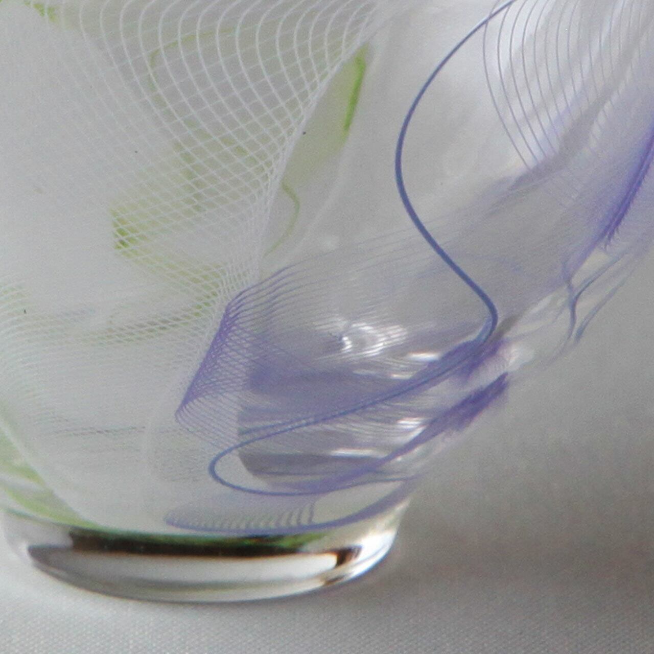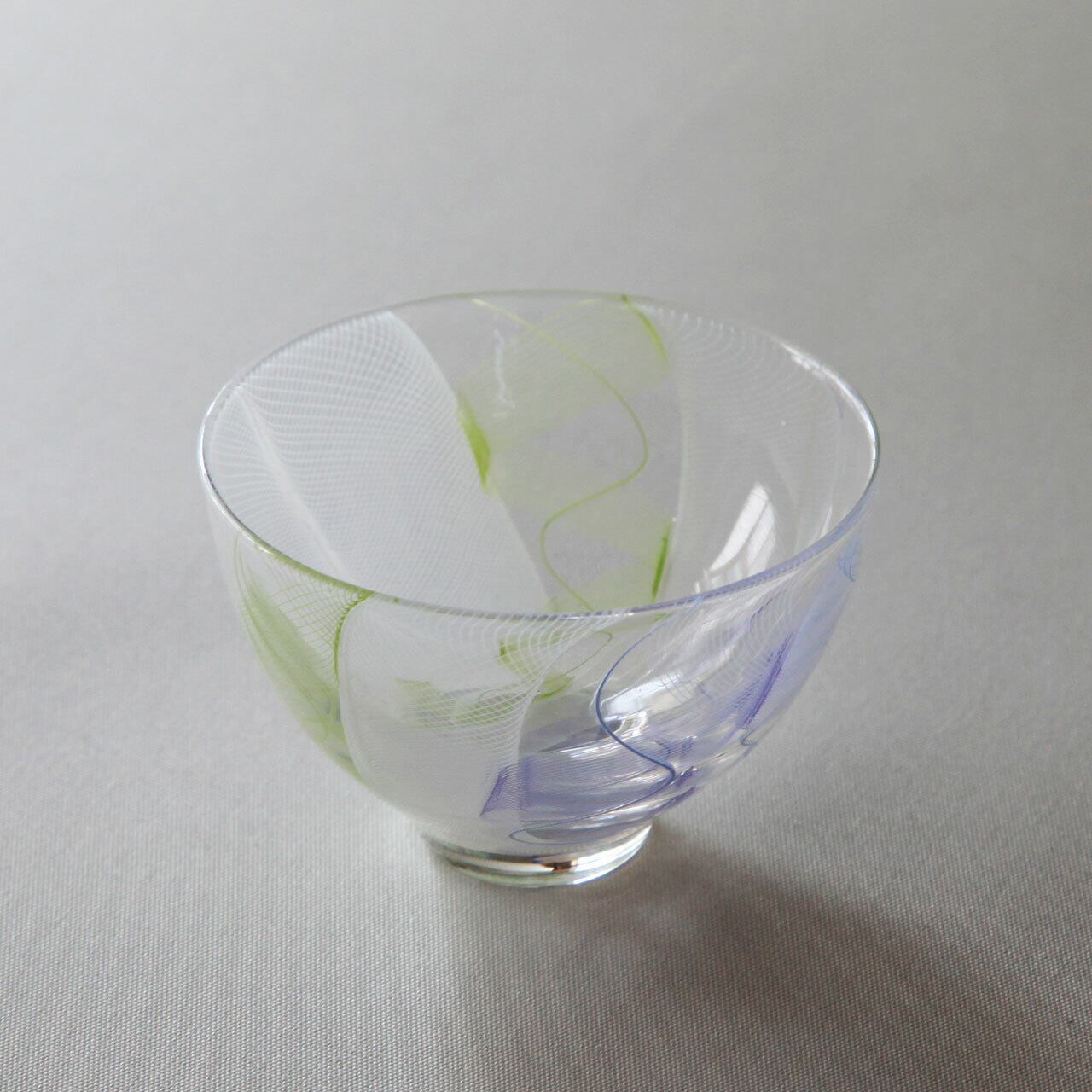 ぐい呑の和の形状をレースガラスで製作し他にはない雰囲気を、色は白、紫、黄緑の三色混合、カラフルで繊細な仕上がりになっています。