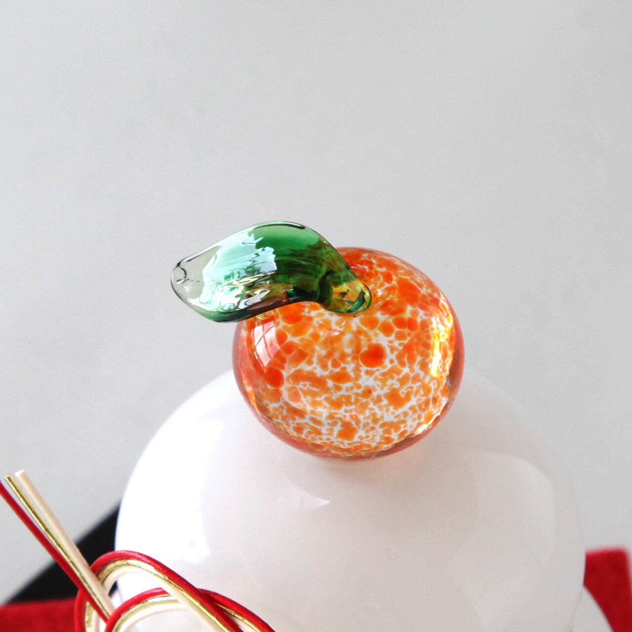 お餅のフォルムはもちろん、橙のオレンジ色の発色や葉っぱの表情なども丁寧に仕上げております。ガラス製ですので陽光や照明など光があるところに飾っていただければより一層際立ちます。また黒台座、水引、赤布、(箱入り)もセットになっていますので鏡餅を引き立ててくれます。